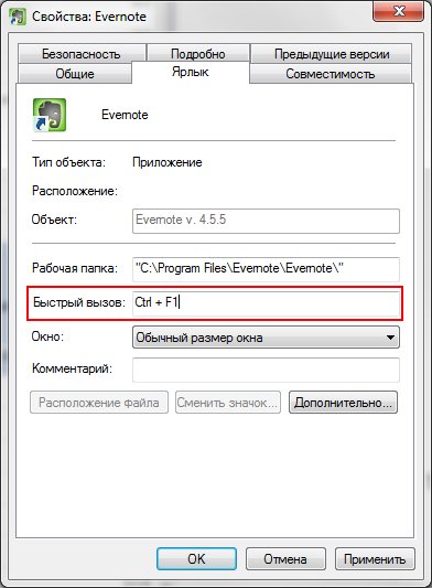 Теперь находим ярлык запуска Evernote, заходим в его свойства (ПКМ — свойства), и в поле «Быстрый вызов» назначаем последнюю горячую клавишу: