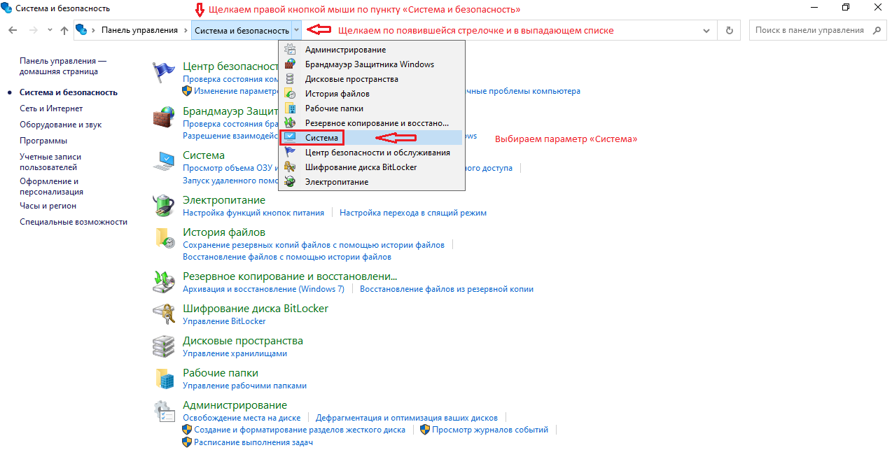 В окне «Система и безопасность», щелкаем в верхней панели по «Система и безопасность» и щелкаем по появившемуся значку (стрелка вниз). В раскрывшемся меню, выбираем «Система»: