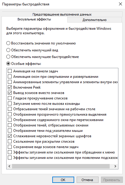 В «Параметрах быстродействия», в отличие от других способов, можно выборочно отметить определенные эффекты, например, чтобы немного повысить производительность, но при этом не ухудшать визуальную составляющую интерфейса. Для этого в окне отметьте «Особые эффекты», а затем в списке ниже выбирайте те компоненты, которые нужно оставить.