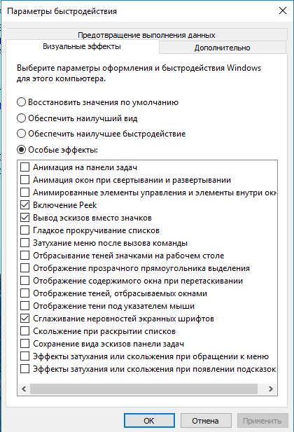 Несмотря на то, что визуальные эффекты в Windows 10 делают работу более плавной и приятной, они потребляют ресурсы компьютера, замедляя его функционирование и нагружая компоненты. Отключить анимационные возможности можно с помощью системного окна «Параметры быстродействия»: