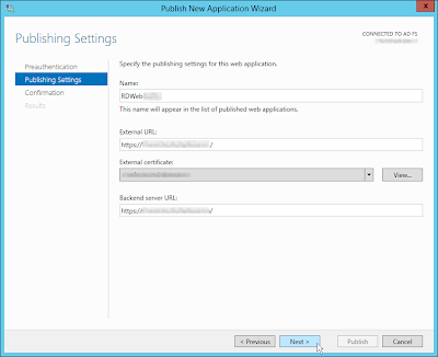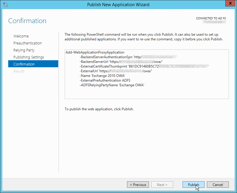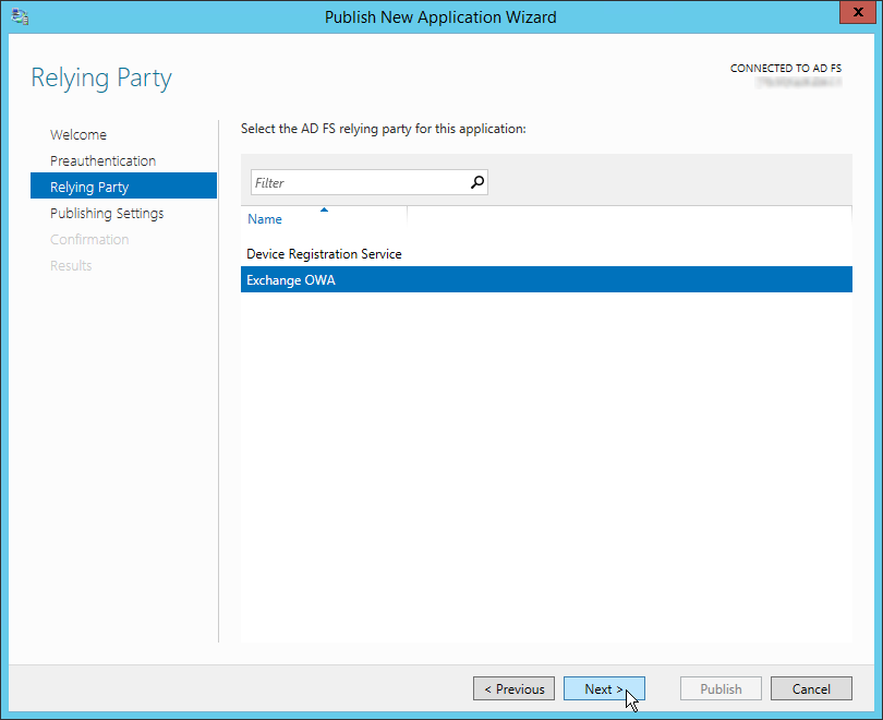 Запустите мастер публикации и укажите, хотите ли вы использовать для преаутентификации службу ADFS (это именно наш вариант).