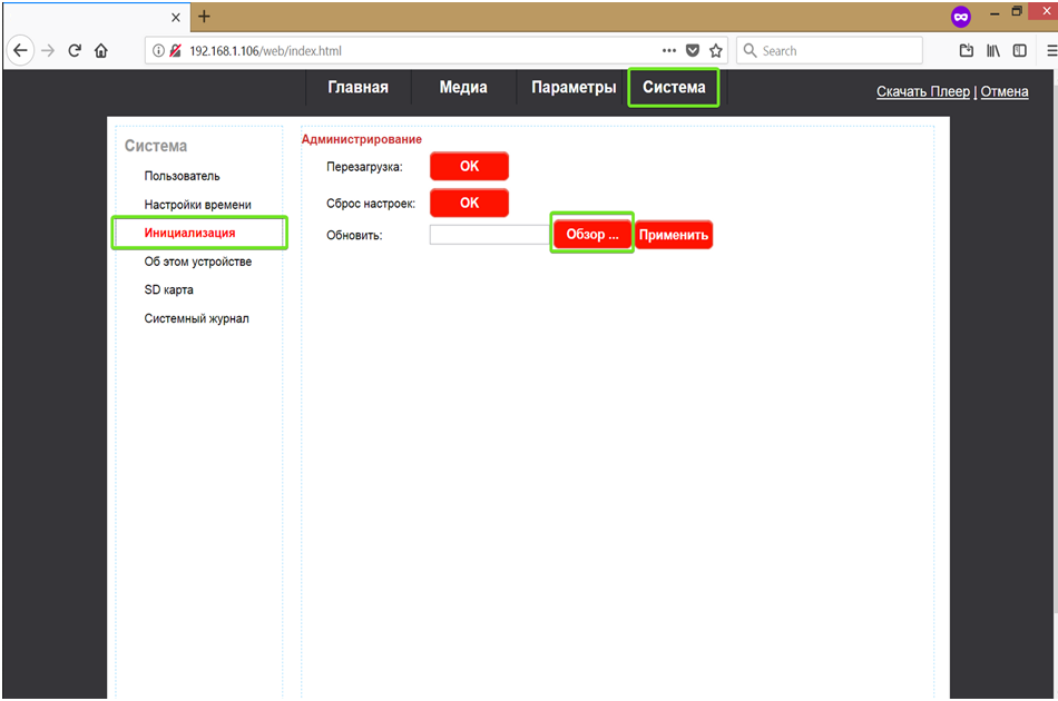 1 — Для SL-10IP, SL-07IP, ML-20IP и XR-30IP необходимо перейти во вкладку «Система», далее «Инициализация» и затем нажать кнопку «Обзор». Выбрать файл прошивки, который вы загрузили ранее, и нажать «Применить».
