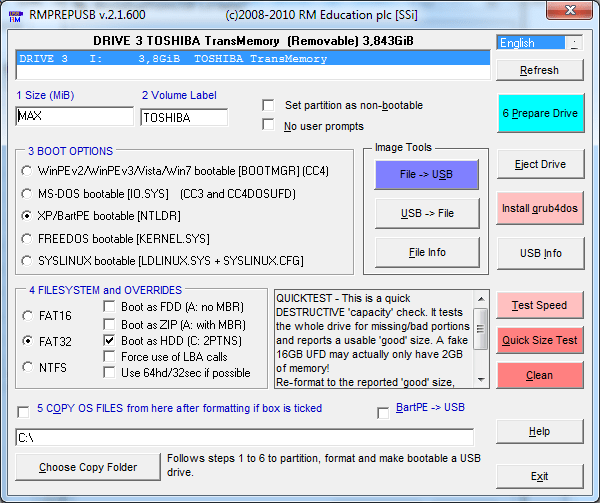 - Утилита не показывает накопитель USB. Воспользуйтесь функцией автоформатирования либо примените RMPrepUSB, BootIce.